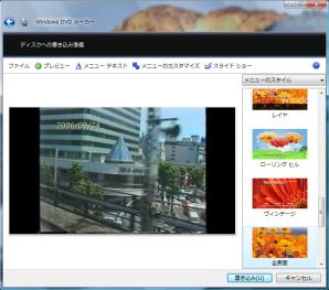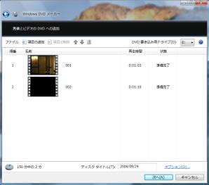 Windows Meの時はビデオ編集ソフトである「Windowsムービーメーカー」が付属したが、今回は更にDVD作成ソフトの「Windows DVDメーカー」がHome PremiumとUltimateに付属している。まずは上記の画面のように動画選択画面が現れる。ここで「項目の追加」で選択するか、ドラッグ&ドロップで追加していく。気になるのは、「150分中の……」と書かれていることだ。1枚のディスクに150分入れさせるつもりらしい。通常の映像用DVD-Rなどは1枚120分となっているから、これが標準だろう。つまりWindows DVDメーカーでは標準より低いビットレートのDVDになってしまうらしい。