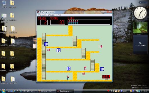 私個人としては気になるのはClick & Createで作ったソフトが動くかと言うことだ。私がゲームやソフトを作るのに使っているClick & Createは、Windows95/NT4.0時代のソフトであり、Windows XPで動いたのも運が良かったと思えるくらいだ。果たしてWindows Vistaで動くか心配だったので試してみた。すると、なんと問題なく動いたのである。ほとんどのソフトを試してみたがいずれも問題ないのである。上記の画像はWindows Vista上で男vs入れ歯が動作している画面である。しっかりタイトルバー部分が半透明になっている。一安心である。