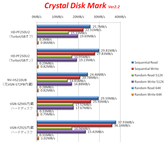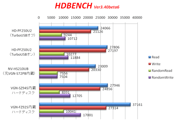 まずは「HDBENCH」のハードディスク関連のテスト結果からである。まず分かることは、TurboUSBの効果は高いと言うことである。HD-PF250U2のTurboUSBをオフにした状態では、NV-HS210UBより若干高速ではあるものの、ほとんど差がない状態である。また、VGN-SZ94S内蔵ハードディスクと比べても遅めである。しかしTurboUSBをオンにすると転送速度が大きく向上し、VGN-SZ94S内蔵ハードディスクと遜色ないレベルに達している。向上率はReadで15.5%、Writeで28.7%となりかなりのものである。さすがにVGN-SZ94Sより新しいVGN-FZ92Sに内蔵されたハードディスクには負けるが、USB接続でありながら少し前のパソコンの内蔵ハードディスクと同等レベルに達しているのは驚きである。実際に使用していても内蔵ハードディスクに比べて遅いとは感じなかった。これが安価な機種で実現されていることはうれしい事である