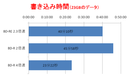 このグラフを見ると、純粋に倍速によって差が付いていると言える。また、計算してみると、BD-Rの2倍速で8744.47KB/s、4倍速で17202.03KB/s、BD-REの2.3倍速で10007.16KB/sである。Blu-rayの1倍速が4500KB/sであることを考えると、BD-Rの2倍速書き込みで1.943倍速、4倍速書き込みでで3.823倍速、BD-REの2.3倍速書き込みで2.22倍速となる。書き込むデータの準備処理やディスクフォーマット、最後にディスクをクローズする処理があることを考えると、ほぼスペック通りのスピードがでている。また、4倍速メディアなら、わずか23分で23GBのデータのバックアップが取れるし、2倍速書き込みでもそれほど遅いとは感じない。DVD-Rなどと比べて、メディアの入れ替えなどの手間がないため、バックアップメディアとしては非常に使いやすいと言える。