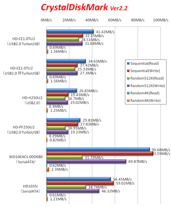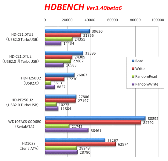 まずは「HDBENCH」のハードディスク関連のテスト結果からである。これらから分かることは4つある。まず「HD-CE1.0TU2」は旧製品の「HD-H250U2」よりは高速化していることが分かる。「HD-CE1.0TU2」のTurboUSBをオフにした状態でも、Readが28.8%、Writeが41.1%高速化している。内蔵するハードディスクの性能がアップしているからなのか、SerialATAからUSBへの変換が高速化しているからなのか不明だが、TurboUSB有無以前に新機種は高速になっている。そして同じ最新機種でも2.5インチハードディスクを搭載したポータブルハードディスク「HD-PF250U2」より高速であることも分かる。これは2.5インチハードディスクと3.5インチハードディスクの差が現れた格好だ。そして、TurboUSBの効果は大きいことが分かる。TurboUSBの有無で、Readが18.0%、Writeが31.0%向上しており、かなりのものである。ただTurboUSBをオンにするだけでこれだけの差があるので、ぜひオンにして使いたい所だ。一方、TurboUSBで高速化しても内蔵ハードディスクと比べるとかなり遅いと言うこともわかる。5400rpm・500GBプラッタの「HD103SI」と比べてReadが25.6%、Writeが49.1%も遅く、より良い値の出ている5400〜7200rpm・334GBプラッタの「WD10EACS-00D6B0」と比べるとReadで55.4%、Writeで62.4%も遅い。速くなったとは言ってもUSB接続のハードディスクと内蔵ハードディスクの間には大きな速度差があると言える。