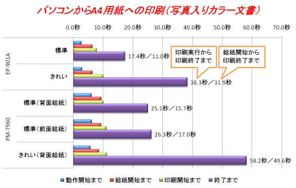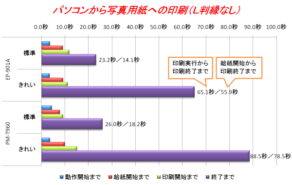 それでは実際に印刷した速度をこれまで使ってきたPM-T960と比較してみよう。原稿は写真入りのA4カラー文書、文字だけのA4モノクロ文書、そして写真の3種類である。A4カラー文書とモノクロ文書はA4普通紙に縁ありで、写真はL判のエプソン写真用紙に縁なし印刷を行っている。それぞれグラフの青が「パソコン上で印刷を実行してからプリンタが動き始めるまで」、赤が「給紙を開始するまで」、黄緑が「印刷を開始するまで」、紫が「印刷が終了して用紙が排紙されるまで」を表している。青のグラフはパソコンからのデータ転送時間を表し、青と赤の差はプリンタの予備動作の時間、赤と黄緑の差は給紙動作の時間となる。また各グラフには秒を数値で表示しているが、左の数字は「パソコン上で印刷を実行してから、印刷が終了し用紙が排紙されるまで」、右の数字は「給紙を開始してから印刷が終了し用紙が排紙されるまで」の時間である。つまり右の数字が実際にプリンタが印刷関連の動作を行っている時間となる。ちなみに使用したパソコンはSONYのノートパソコン「VGN-SZ94S」でCPUがCore 2 Duo T7100(1.80GHz)、メモリが2GB、OSがWindows Vista HomePremiumとなる。両機種とも有線LAN接続をしており、EP-901Aでは前面給紙カセットの下段に、PM-T960では背面と前面それぞれに用紙をセットしている。