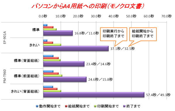 続いてA4モノクロ原稿の印刷速度である。A4カラー原稿の場合と同じく、EP-901AはPM-T960より高速化を果たしている。また両機種ともカラー原稿と時間の差はほとんど無い事がわかる。確かにPM-T960はカラーインクもモノクロインクも各90ノズル、EP-901Aも各180ノズルと、カラーと黒インクでノズル数に差がないため、カラー印刷もモノクロ印刷も同じ速度になっているのだと思われる。