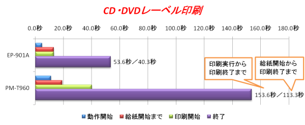 せっかくなので、レーベル印刷速度も比較してみよう。これは圧倒的な差が出ている。印刷実行から印刷終了までの時間では、153.6秒から53.6秒と2.87倍に高速化しているのである。これはまず、CD/DVDトレイが内蔵され、印刷開始時点ですでに印刷開始位置にセットされていることが要因だろう。グラフを見ると動作が開始するまでの時間も若干短くなっているが、EP-901Aでは給紙処理が不要のため赤と黄緑のグラフが同じになっており、ここで大きな差が付いている。PM-T960ではトレイを給紙し位置あわせを行うのに21.2秒もかかっていたことから、これが無くなるのは大きい。結果的に印刷実行から実際に印刷が始まるまでの時間が40.3秒から13.3秒と、3分の1以下になっている。さらに、印刷時間も短くなっていて、PM-T960では113.3秒かかっていたのが、EP-901Aでは40.3秒とかなり高速化を果たしている。写真やカラー原稿の印刷速度ではここまでの差が付いていなかったことから、トレイが内蔵されたことにより高速に印刷しやすくなったのではないだろうか。