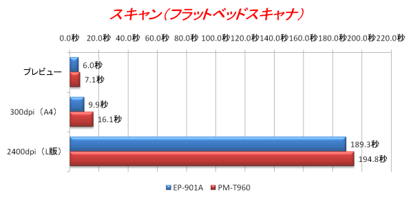 続いてスキャン速度をPM-T960と比較してみよう。これを見るとCIS方式だからといってスキャンが遅いという事はなさそうだ。プレビューが遅いと、原稿の角度を何度も調整したりする際に不便なのだが、これも16%高速になっているため、問題ない。A4サイズの300dpiでのスキャンでは、39%も高速になっている。L判サイズの2400dpiのスキャンでは差はほとんど無くなっているように、グラフにはないが600dpi、1200dpiと解像度が上がると差は小さくなっていくが、それでもPM-T960より遅いという事はなかった。CIS方式はCCD方式より遅いというイメージが強かったが、最近ではかなり改良されいるようだ。最新のCCDスキャナと比べれば遅いのかもしれないが、PM-T960でも遅いとは感じなかったため、PM-T960より高速ならば十分合格点である。CISスキャナと言うことが購入時の一番の不安材料だったが、浮いてしまう原稿以外では問題ないレベルであることがわかりホッとした。