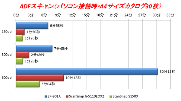 これを見ると、EP-901Aの遅さがわかる。ScanSnap fi-5110EOX2との比較では、150dpiで3.75倍、300dpiで2.75倍、600dpiでは2.97倍もの時間がかかっている。ScanSnap S1500との比較では、それぞれ4.69倍、5.28倍、5.97倍と、非常に大きな差である。最新のScanSnap S1500はまだしも、ScanSnap fi-5110EOX2は2004年10月19日発売の製品であり、EP-901Aの4年近く前の製品であるにも関わらず、全く速度ではかなわない。しかも実際にはScanSnapの2機種は両面スキャンも同速度で行えるため、両面原稿の場合は差がさらに倍になることになる。実際に動作を見ていても原稿送りが非常に遅いので驚いたほどだ。150dpiでは4.35枚/秒、300dpiでは3.87枚/秒、600dpiでは0.99枚/秒となるため、300dpiまでならかろうじて使えるレベルだが、600dpiになると遅すぎて実用的でない。確かにScanSnapとは異なりTWAINに対応しているため、TWAIN対応ソフトウェアから直接スキャンできる上、保存形式にもビットマップやTIFFが選べるなどの利点はあるが、さすがにここまで遅いと雑誌などの電子化といった用途に向いているとは言い難い。ただ一方で、数枚の原稿を取り込んで編集したり、数十枚程度のコピーを行うといった用途になら使えるレベルであるし、ADFが無いよりはよっぽど便利なので、あるにこしたことはないだろう。