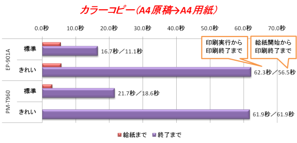 それでは、コピーの時間を比較してみよう。A4のカラー原稿をA4用紙に等倍コピーを行った。これは意外な結果で、「標準」設定ではPM-T960が21.7秒のところを16.7秒と23%高速化しているが、「きれい」設定では差が無くなってしまっている。A4カラー原稿の印刷ではEP-901Aの方が高速だっただけに、これは不思議である。しかし、給紙開始から印刷終了までの時間では「標準」モードで40%、「きれい」設定でも9%、EP-901Aの方が高速である。つまり、コピーを実行してから給紙されるまでの時間がEP-901Aの方が遅いのが原因のようだ。PM-T960ではコピー開始ボタンを押してから、「標準」設定で3.1秒、「きれい」設定ではほぼ同時に給紙が開始されている。ところが、EP-901Aでは「標準」設定で5.6秒、「きれい」設定で5.8秒となっている。新機種の方が遅い事になるが、ここで一つ気になるのが、EP-901Aに新たに搭載された「領域判定コピー」機能だ。コピー時に文字領域と画像領域を自動判別して、文字領域では文字の再現性を重視、画像領域では色再現性と細部再現性重視して画像処理を行ってコピーするという機能である。これにより、内部処理が複雑になっているために、給紙して印刷が行える様になるまでの時間がかかるようになったのではないだろうか。たしかにコピーしたものを比較すると、PM-T960と比べて、文字部分ははっきり見やすく、画像部分は原本に近い色合いでコピーできているようである。コピー画質が上がっているので、数秒程度コピーが遅くなったとしても、気にならないといえるし、印刷スピードの高速化により、PM-T960より遅くはなっていないのだから実用性は十分だろう。