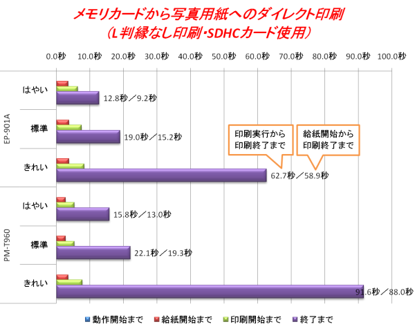 それではメモリカードからL判写真用紙へダイレクト印刷を行ったときの速度を見てみよう。EP-901AとPM-T960との比較では、給紙開始までの時間や印刷開始までの時間がEP-901Aの方が若干伸びてしまっているが、印刷自体の速度はEP-901Aの方が高速であることから、どの画質設定でもEP-901Aの方が高速である。特に「きれい」画質設定では、30秒近くの短縮となっており、印刷枚数が多いときには重宝しそうだ。ちなみに、前述のパソコンからの印刷の時と比べると、「標準」画質設定ではパソコンからの印刷では23.2秒のところがダイレクト印刷では19.0秒に、「きれい」画質設定では65.1秒のところが62.7秒となっている。ダイレクト印刷ではEP-901Aの内部での処理になるため印刷が遅くなるかと思ったが、逆にダイレクト印刷の方が高速であるというのは意外な結果であった。ただ、給紙開始から印刷終了までの時間を見ると、「標準」画質設定ではパソコンからの印刷では14.1秒のところがダイレクト印刷では15.2秒に、「きれい」画質設定では55.9秒のところが58.9秒となっており、ダイレクト印刷の方が若干だが時間がかかっている。つまり、パソコンからの印刷では印刷を実行してから動作を開始するまでのタイムラグがあるが、ダイレクト印刷ではそれがないために、全体ではダイレクト印刷の方が高速になったのである。しかしこれは1枚の場合の話で、2枚目以降はパソコンからの印刷でもタイムラグはなくなることから、給紙開始から印刷終了までの時間がかかる事になる。そうなると若干ながらダイレクト印刷の方が遅いことになる。とはいえ、1枚辺り数秒の遅さであり、100枚印刷したとしても数分の違いであるため、ほとんど気にならない。むしろダイレクト印刷でも極端に遅くなること無く印刷できるため、安心してダイレクト印刷を利用できることがわかったと言える。