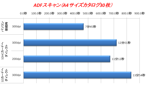 ではここで、「スキャンしてメモリカードに保存」のスキャン速度を比較してみよう。EP-901AのメモリカードスロットにSDHCカードを挿し、200dpiの「速度優先」と300dpiの「画質優先」でスキャンした。スキャン時間が比較しやすいよう、ADFを利用してA4サイズのカタログ30枚をスキャンし終えるまでの時間を計測した。また比較対象として、パソコンから300dpiでスキャンした場合と、利用するカードを低速のSDカードに変更した場合でも計測した。SDHCカードは書き込み速度が実測値で7.96MB/s、SDカードは3.63MB/sのものを利用しているため、カードの書き込み速度によってスキャン時間に差が出るのかがわかるはずだ。