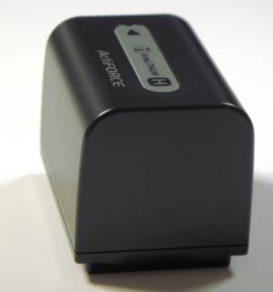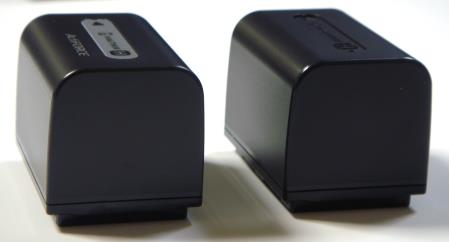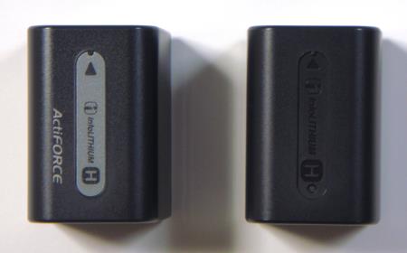 それでは、NP-FH70を見てみよう。HDR-SR11に付属していたNP-FH60と比べると、当然サイズは全く一緒である。しかしデザイン的には、NP-FH60は「インフォリチウムロゴ」が彫り込みだけで書かれているのに対して、NP-FH70は白色のプレートがはめ込まれロゴが印刷されたものになっているため、一目でどちらかが分かる。取り付けるときにわざわざ裏側の小さな型番の文字を読む必要がない点は便利である。重量はさすがに持ってみると違いが分かる。しかし20gの差であるため、HDR-SR11本体に取り付けた場合、NP-FH60だと640gなのに対してNP-FH70だと660gとなり、差はわずかとなる。