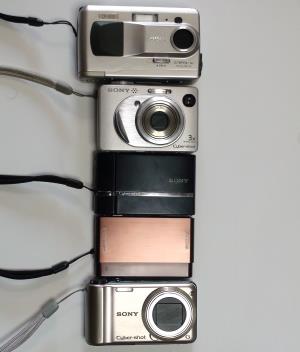 続いてサイズを比較してみよう。まずは正面から見た大きさである。公開購入したDSC-HX5Vは高性能な機種であるため、これまでの機種と比べると大型化しているのは仕方のないことだろう。それでも、DSC-T77やDSC-T50と比べても縦はほぼ同じで、横幅が8〜9mm増えているだけである。3世代前のDSC-W1と比べると横幅は10mm以上大きくなっているが、縦は逆に小さくなっている。そのことから見ても特別大きいというわけでもない。