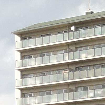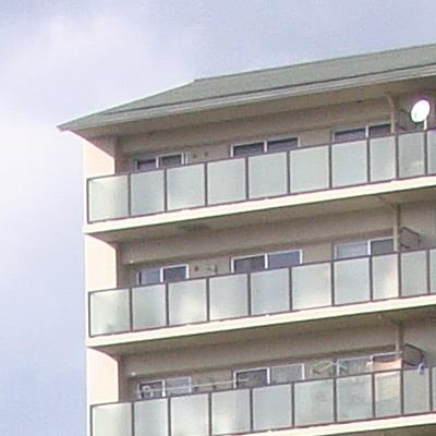 2枚写真があるが、上の写真から見ていこう。どちらの機種でも撮影した写真は3648×2736ドットとなり、上の写真はそれを400×300ドットに縮小表示した物である。これを見ると色調等に大きな違いはない。目で見た感じとそれほど違和感なく、不自然にコントラストが高いと言うこともない。ただし、この写真では分からないが、赤や黄色など色鮮やかな物を撮影すると、DSC-HX5Vの方がより色鮮やかに撮影できているように感じた。これも不自然に色が濃いのではなく、色がしっかり出ているという様なイメージである。そしてこの2枚を見て気づくのは、やはり撮影できている広さの違いだろう。これはもちろん焦点距離の違いによるもので、DSC-T77が35mmフィルム換算で35mmなのに対して、DSC-HX5Vが25mmとなっている事が良く現れている。このような場面では真価がはっきりしないが、狭い部屋の中や乗り物の中など撮影する際には、非常に便利である。また、25mmまで広角だと、周辺がゆがんでしまいがちだが、DSC-HX5Vではうまく補正されているようで、ほとんど気にならないレベルであった。もちろん周辺部は若干のゆがみが発生するが、従来のコンパクトデジカメにもある程度のレベルに抑えられており満足できるレベルだ。 続いて下の写真を見てみよう。これは上の写真の一部分を切り取った物で、縮小処理をしていない。つまり上の写真の等倍表示するとこの画質で見られるわけである。一見するとどちらも細部まできれいに撮影できているように感じる。しかし屋根の部分や、最上階の屋根で陰になっている部分を見ると、DSC-HX5Vの方が明らかにノイズが少ない用に見える。裏面照射型CMOSは暗いシーンでノイズが少なくなる点が注目されているが、明るいシーンでもノイズ量は少なくなっているように思える。DSC-HX5Vの画質の良さが垣間見える結果であった。