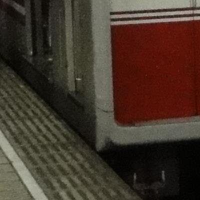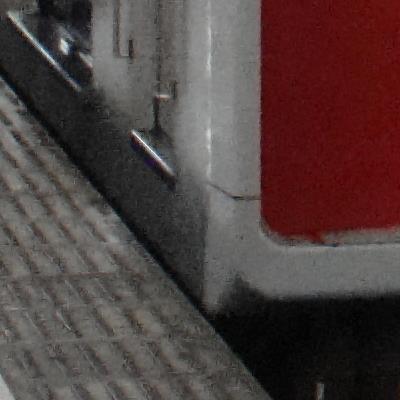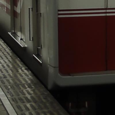 まずは、「やや暗い場所での撮影画質を検証する」で撮影した場所で、「手持ち夜景モード」にして撮影した写真である。1枚目の写真全体を見ると、「手持ち夜景モード」の方が若干暗く写っていることが分かる。しかし、2枚目と3枚目の写真を見てみると、その差は歴然である。2枚目の写真では車両の前面にあったざらざら感が全くといっていいほど無くなっており、目で見たのと同じきれいな質感になっている。また背景に写っている広告までノイズがすっかり消えている。また3枚目の方では同じく車両前面のノイズが消えて、赤いラインがくっきりしている。さらに驚くべきは、車両側面のドアの下部に点いている金属のステップが、「高感度撮影モード」ではノイズでつぶれてしまい、何が何だかよく分からなくなっているが、「手持ち夜景モード」ではノイズが消えているだけでなく、金属の質感まで分かるほどまできれいになっている事である。ここまで質感が忠実に撮影できるのはすばらしいといえる。またホームの床の端にある滑り止めのような部分もノイズが消えてはっきりしただけでなく、すこし膨らんでいるという事まで認識できるようになっているのである。これほどの差とは驚きである。 |