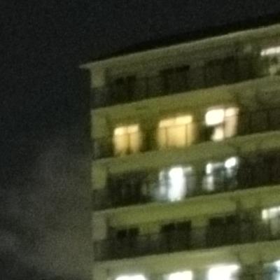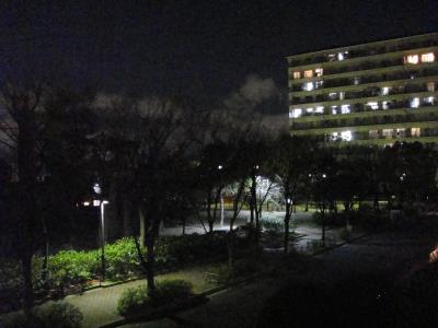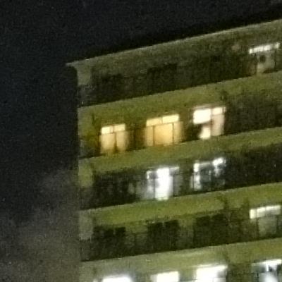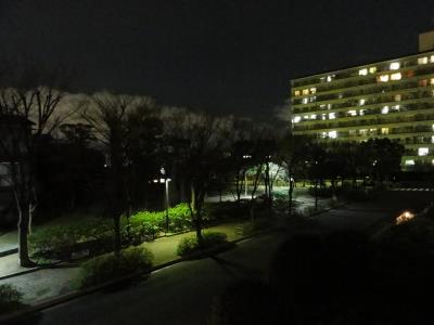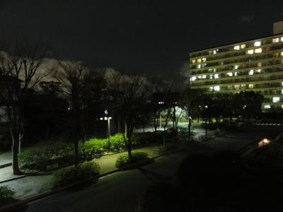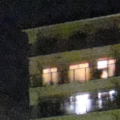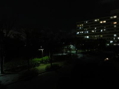それでは非常に暗い場所での撮影画質を見てみよう。明るい場所でのテストと同じ場所の深夜に撮影している。マンションの敷地内なので街灯の数も一般道に比べると少なく暗い印象である。上の写真は高感度モードにせず、ISO800相当でシャッタースピードを1/4秒にして撮影したものである。かなり暗く写っており、肉感ではこれと同等か、もう少し暗い感じである。この状態で高感度モードにし、ISO3200相当で撮影を行っている。 |