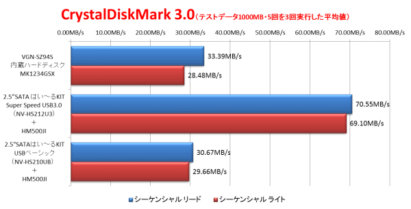 それでは、ベンチマークテストを利用してどのくらいの速度が上がったかを検証してみよう。テストは、「Crystal Disk Mark 3.0」を使用して、シーケンシャルリード・ライト性能を計測している。テスト条件は、テストデータ1000MBでテスト回数5回としたテストをさらに3回行い平均値を出している。接続したパソコンは、SONYのノートパソコン「VGN-SZ94S」でCPUがCore 2 Duo T7100(1.80GHz)、メモリが2GB、OSがWindows Vista Home Premiumである。これに、USB3.0インタフェースカード「IFC-EC2U3/UC」を挿し、そこに接続してテストを行っている。比較対象としてこれまで使用してきたUSB2.0接続のドライブ「NV-HS210UB」に内蔵した時もテストを行っている。インタフェースによる差が出ない様に、USB2.0ドライブもUSB3.0ポートに接続している。また、VGN-SZ94S内蔵のハードディスク(80GB・5400rpm)でも同様のテストを行っている。