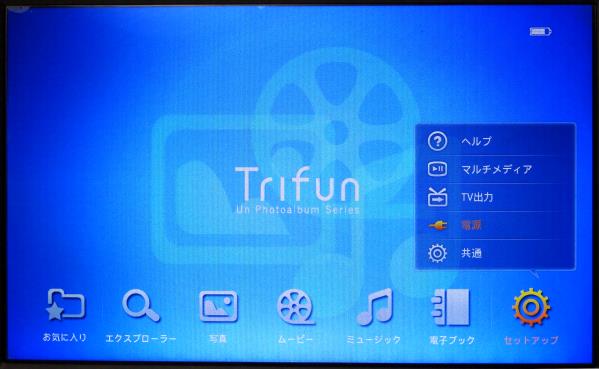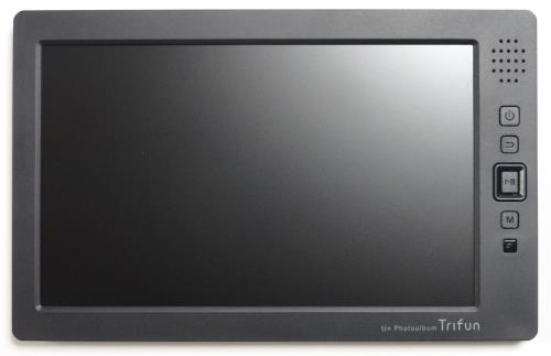しかし、そんな中で、ぴったりの製品を見つけたのだ。それがエレコムの「Trifun DPF-A8WM10」である。この製品は実はデジタルフォトフレームなのだ。ただ、一般のデジタルフォトフレームと違いバッテリを内蔵しているのである。また、フォトフレームといっても、一般的なフォトフレームのように液晶のフレームが太くなく、タブレット端末の様に狭く、スタンドも収納式の小さな物なので、一見するとただの液晶ディスプレイに見え、「デジタルフォトフレームを持ち歩いている」ように見えないのもミソだ。そして何より、画面サイズが8インチでありながら1280×768ドットという高い解像度なのが一番気に入ったところだ。一般的なデジタルフォトフレームでは800×480ドットという解像度を採用する例がほとんどであるため、7インチタブレットよりも高い解像度を採用しているのはある意味奇跡と言えよう。また2GBの内蔵メモリだけでなくSDカードスロットを持っているのも合格だ。最近ではSDカードが安くなってきているため、何枚ものSDカードに漫画や小説データを入れておき、読みたいデータの入ったカードを挿すという方法をとりたいため、SDカードスロットは必須なのだ。SDHCに対応しているため、32GBまでの容量のものが使えるのも良い。SDXCには対応していないのはフォトフレームとしては使いにくいのかもしれないが、今回の用途では問題にならない。そして、タブレット端末の採用するmicroSDではなく、標準サイズのSDカードに対応しているのも、より安価で高速なカードが手に入るためうれしい点だ。その上、価格は1万円強と、タブレット端末とは比べものにならないくらい安い。前述のように液晶のフレームが狭いので、8インチ液晶を搭載していても、本体サイズは縦213mm×横134mmで、厚みはわずか14mmしかない。重量も380gと軽量で、7インチタブレット端末並みだ。前述のようにバッテリを内蔵しており、静止画のスライドショーで公称値3時間とまずまずの駆動時間だ。スキャンした本を読むのも、写真のスライドショーも、定期的に画像が切り替わり、常に画面のバックライトが付いているといった点では似ているため、電子書籍リーダとして使用する分にも3時間に近いバッテリ駆動時間となるはずだ。横768ドットに変換したスキャンした本の画像を4,000枚近くSDカードに入れて店頭で試してみたが、固まることもなく、カードを挿して数秒でフォルダが表示され、すぐに階層を潜って目的の本を開き閲覧することができた。対応する画像形式もJPEG、BMP、PNGとなっており、これを見る限りでは電子書籍リーダとして問題なく使えそうだ。 それ以外に、今回の本来の目的ではないが、動画の再生や音楽の再生もできる。動画はMPEG-1(mpg)、MPEG-4 AVC/H.264(mp4)、MotionJPEG(avi)に対応しており、音楽はMP3、AAC(m4a)、PCM(wav)に対応している。スライドショー中でも音楽再生ができるということで、音楽を聴きながら電子書籍を見るということもできそうだ。店頭で使ってみた分にも問題なさそうなので、実際に購入して使ってみることとした。Amazon.comで10,635円であった。