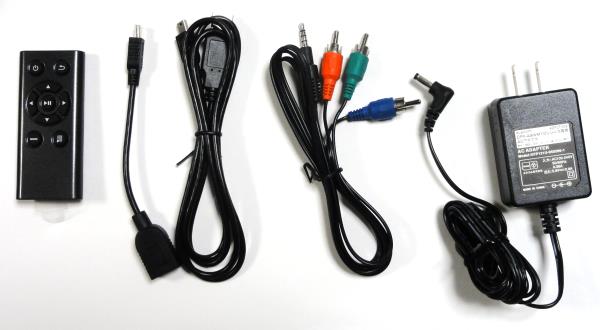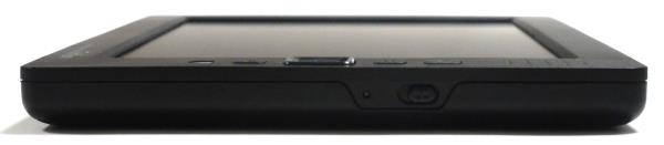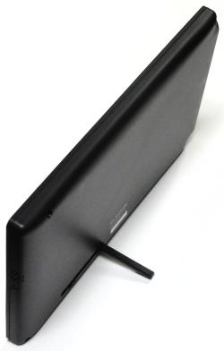 それでは、早速製品を見てみよう。箱から取り出してみると、思ったよりも小型で軽量である。また薄型である。実際にはそれなりの面積があるのだが、液晶ディスプレイのフレーム部分が小さく、ほとんどが液晶ディスプレイで占められているので、小さく見えるのだ。Androidタブレットなどと違いタッチパネルにはなっていないので、右側(電子書籍リーダ風に使うときは下側)には、ボタンが並んでいる。上から順に「電源」「戻る」「十字キーと再生・一時停止」「Mボタン」となっている。「再生・一時停止」のボタンの周囲が四方向キーとなっている形状だ。またそれらのボタンの下にリモコンの受信部があるのが、デジタルフォトフレームらしさだ。各ボタンは「電源」ボタンが8mm四方の正方形、「戻る」「Mボタン」は少し小さめの7mm四方の正方形、「再生・一時停止」ボタンは縦10mm、横7.5mmとやや大きめで、その周囲2.5mm分が四方向キーだ。液晶のフレームが小さいのにあわせて、ボタンはかなり小さい。ただ、ボタンを押した感じは堅すぎもせず、思ったより押しやすい。 右側面には充電ランプとスライドスイッチが用意されている。電子書籍リーダとして使用する場合に下側になり、手で持つ位置になるので、側面にボタン類がないのはうれしいところだ。反対の左側面は、上からminiUSB端子(miniAB)、SDカードスロット、ビデオ出力端子、イヤホン端子、電源コネクタとなっている。ビデオ出力とイヤホン端子の形状が同じだが、1つだけ黄色い端子がビデオ出力となっている。ビデオ出力端子は、後述の付属品で、コンポーネット出力に変換して使用する。 デジタルフォトフレームと言うこともあって、背面にはスタンド用の脚があるが、非常に小型で収納式な上、収納時の背面はフラットとなるので、電子書籍リーダとして使う分に邪魔になることはない。一方、デジタルフォトフレームとして使う分には、それほど不安定には感じなかった。ただし、縦置きには対応していない。 付属品は、ACアダプタやリモコン、パソコン接続用のUSBケーブルの他、TV出力ケーブル、さらにUSB端子にUSBメモリやメモリカードリーダを接続できるよう、USBホストケーブルも付属する。必要なものは一通りそろっている感じだ。ACアダプタは、コンセント部分にアダプタが付くタイプだが、縦に長い形状なので、電源タップでもある程度邪魔にはならないだろう。また、小型であるため持ち運びには問題なさそうだが、端子部分を収納できないのは残念だ。持ち運ぶことは想定されていないのだろう。