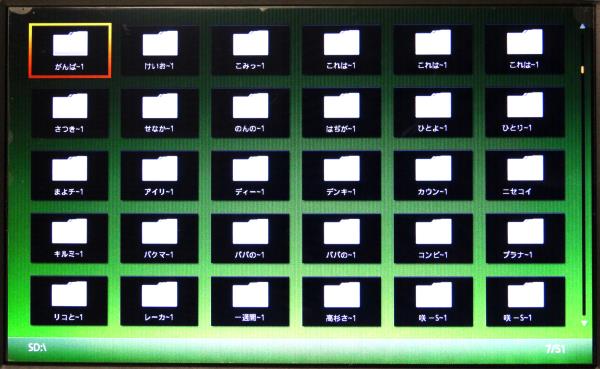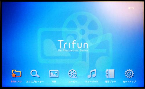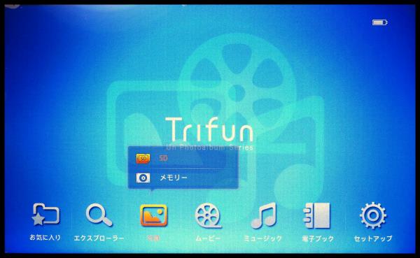 それでは、実際に電源をつけて使ってみよう。側面のスライドスイッチを入れると電源が入る。AndroidタブレットやiPad、パソコンのように、OSがあって自由にソフトウェアを追加するような製品ではないため、初期設定などは一切無くすぐに起動する。正式には、7秒でロゴが表示され、10秒で使用できるようになる。 メインメニューは、下部にアイコンが7つ並んでおり、それぞれ「お気に入り」「エクスプローラー」「写真」「ムービー」「ミュージック」「電子ブック」「セットアップ」となっている。今回は電子書籍リーダとして使用するので、「電子ブック」というアイコンが気になるが、これはテキスト形式のものが表示できるだけで、インターネット上で購入する電子書籍の形式のものは開けない。今回は書籍をスキャンしてJPEGまたはPNG形式の画像として保存したものをSDカードに入れて、「Trifun DPF-A8WM10BK」挿し込んである。そこで、選ぶアイコンは「写真」という事になる。カーソルキーで写真を選んで、真ん中のボタンを押すと「SD」か「メモリー」かの選択肢が表示される(SDカードを差し込んでいる場合のみ)。「メモリー」とは内蔵メモリの事なので、ここでは「SD」を選ぶと、SDカード内のフォルダが表示される。フォルダを一つ選択すると、1階層中に入れ、「戻る」ボタンで1階層外のフォルダに移れる。SDカード直下の位置で「戻る」ボタンを押すと、メインメニューに戻れる。また、どの階層にいても、「電源」ボタンを押すと、メインメニューに戻れるのは便利だ。フォルダを入っていき、画像が入ったフォルダに入ると、サムネイルが順に表示される。サムネイルは横6×縦5の30コマとなる。SDカード内に入った1100×768ドットの画像の場合、5.5秒ほどで30コマすべてが表示された。 この中でいずれかの画像を選択すると、画像1枚が表示される。あとは、カーソルキーの上下で画像を進めたり戻ったりできる。書籍を読む形で縦向きに持った場合は、カーソルキー左で次に進み、右で前に戻る。これが基本的な操作方法だ。