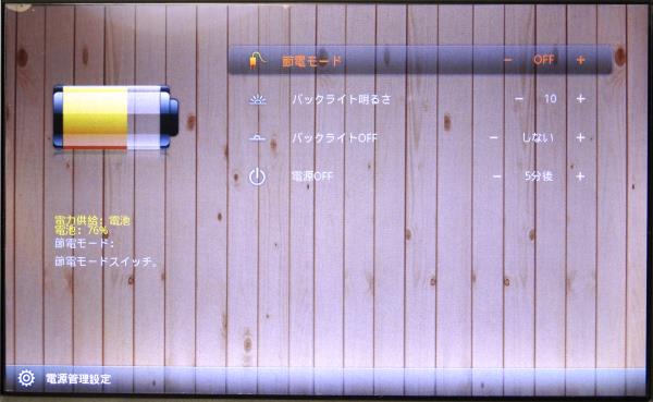 電源のオン・オフに関しては、2通りの方法がある。正面にある電源ボタンを長押しすると電源が切れ、電源が切れた状態で長押しすると電源が入る。もう一つは側面のスライドスイッチを「OFF」にすると電源が切れ「ON」にすると電源が入る。最初、正面のボタンで切った場合はスタンバイで、側面のスライドスイッチが主電源かと思っていた。テレビで言うところの、リモコンで切るのが正面のスイッチ、本体のスイッチを切るのが側面のスライドスイッチというイメージだ。ところが、どちらの場合でも、電源が切れるときも入れるときも同じ時間がかかるのだ。画面の表示も全く同じである。そのことから単に2種類の方法が用意されているだけのようだ。お互いは独立しているので、正面のボタンでオフにして、側面のスライドスイッチでオンにすると言ったことはできない。また、側面のスライドスイッチをオンにした後、正面の電源ボタンを押す必要はなく、スライドスイッチをオンにするだけで電源が入る。 どちらが便利かと言われると難しいところだ。側面のスライドスイッチは小さく、それほど飛び出てもいないため、手探りで素早くスライドさせるのは難しい。しかし正面の電源ボタンは長押ししなければいけないため、急いで電源を切りたいときなどは結構焦ってしまう。しかし、実際には側面のスライドスイッチを常用している。正面の電源ボタンは、過去に何かの弾みで押されてしまい電源が勝手に入るという事が何度かあったからだ。側面のスライドスイッチなら、小さいため何かに引っかかってスライドしてしまうとは考えにくい。 側面のスライドスイッチを使う理由がもう一つある。充電時には付属のACアダプタを接続するのだが、正面の電源ボタンで電源オフにしていた場合、ACアダプタを接続したとたんに起動してしまうのだ。謎の仕様だが、これは側面のスライドスイッチでオフにしておけば防ぐことができる。充電のたびに自動起動したものを手動で電源オフにするのも面倒なので側面のスライドスイッチの方が便利だ。 バッテリ残量に関しては、「セットアップ」−「電源」を見ると、おおまかな残量が表される電池型の画像だけでなく、1パーセント刻みで数値で表示されるため、非常にわかりやすい。それでは、実際にどの程度の駆動時間があるのか見てみよう。フル充電の状態で、以下のテストを行った。