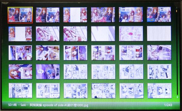 とりあえずフォルダを選ぶと、1階層中に入れる。このようにして画像のあるフォルダまで入ると、画像がサムネイル表示される。前述のようにサムネイル表示は比較的高速で、液晶ディスプレイが高解像度であることもあって画像がある程度判別できるのは便利だ。ただし、ここではそれぞれのサムネイルにファイル名は表示されない。選択した画像だけが、フルパスと共にファイル名が最下段に表示される。とはいえ、電子書籍リーダとして使用する分には、頭から見ることは決まっているわけで、一番左上のファイルを選択する。こうすると、1ページずつ表示される。あとは前述のように、十字キーでページを移動できる。