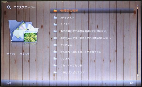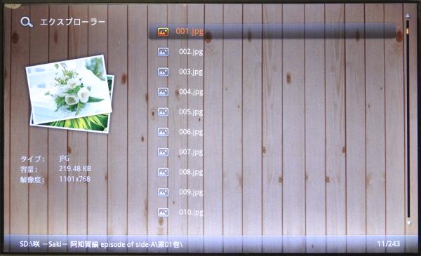 おもしろい点が一つある。「エクスプローラー」から入った場合、画像を表示している状態から「戻る」ボタンを押すと、「エクスプローラー」に戻る。これは当然の動作だ。ところが、一度電源を切ったあとだと、「戻る」ボタンを押すと、画像のサムネイル表示、つまりメインメニューの「画像」から入った時の動作になるのだ。電源を切るときに、見ていたページは保存するが、どういった手順で画像を開いたかは保存しないらしい。基本的に「エクスプローラー」の方が便利なのでこちらを使いたいが、電源を一度切ると「エクスプローラー」に戻れないのは残念だ。
