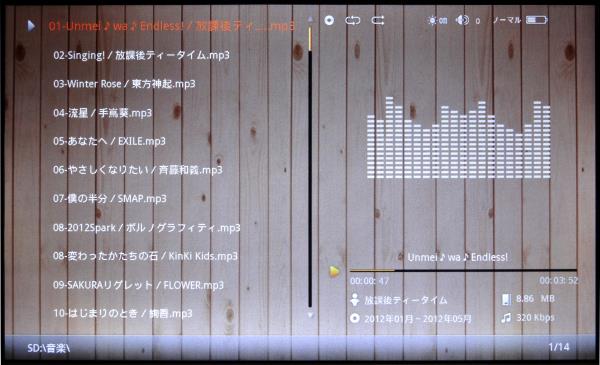 「Trifun DPF-A8WM10BK」には動画と音楽の再生機能も付いている。今回は電子書籍リーダとして使用するのが一番の目的だが、これらについても簡単に検証してみよう。 まず、動画については対応しているファイル形式はMPEG-1(mpg)、MPEG-4 AVC/H.264(mp4)、MotionJPEG(avi)である。デジタルカメラやデジタルビデオカメラ、携帯電話の動画撮影機能の形式のほとんどに対応しているといえる。実際にディスプレイ解像度に近い1280×720ドットのMP4形式の動画のを再生してみたところ、コマ落ちもなくスムーズに再生された。音声も問題なく、再生された。スピーカーが小型であるため出力も大したものではないようだが、静かな部屋なら問題なく聞き取れる。またイヤホンを挿せば十分に高音質に聞くことができる。早送りや巻き戻しと言った操作も快適であった。旅行の移動中に映画や録り貯めた番組を見るといった使い方もできるだろう。また、デジタルカメラ「DSC-HX5V」で1920×1080ドット60i(ビットレート17Mbps)のフルハイビジョン動画を撮影し、そのSDカードをそのまま「Trifun DPF-A8WM10BK」に挿し込んだところ、フォルダ内の動画が再生できた。AVCHD形式で解像度も高いこともあって、コマ落ちのような、一瞬引っかかるような感じを繰り返すため、スムーズさにはかけるが、問題なく見ることができる。その上デジタルカメラ「DSC-HX30V」で1920×1080ドットの60p(ビットレート28Mbps)の動画を撮影したものも再生できた。60pはプログレッシブ方式で、情報量でいれば倍になっているにもかかわらず、多少スムーズさにはかけるものの再生できたのには驚いた。デジタルカメラや携帯電話で撮影した動画の確認にも使えそうだ。意外と再生能力が高いことが分かったので、様々な型式の様々な解像度で動画を作成し、再生テストを行った。その結果が以下の通りである。