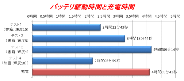 まずは書籍(画像)の再生を見てみよう。液晶の明るさを最大にしたときの駆動時間は2時間22分43秒。ちょっと持ち出して利用したり、自宅で読むような場合には十分とも言えるが、旅行などの長時間の移動中に読むと言った場合には約2時間半というのはやや心許ない。また、公式の駆動時間の3時間にも及ばない。しかし、液晶の明るさを5に落とすと、駆動時間は一気に3時間13分まで伸びる。約19%の伸びである。もともと明るさ10でもそれほど明るいわけではないが、逆に明るさ5まで落としてもそれほど暗くはならない。十分に読みやすいレベルを保っている。駆動時間を重視するなら明るさは5程度まで落とすのが良さそうだ。さらに明るさを1まで落とすと駆動時間は4時間09分14秒になる。明るさ10の時と比べると、53%も長くなっている。さすがにかなり暗く感じるが、それでも真っ暗と言うほどではないため、細かい字も読むことができる。バッテリ駆動時間と視認性を天秤にかけて決めた方が良さそうだ。幸い、設定は再生中でも簡単に行えるので、書籍によって変えるなど柔軟に対応できる。 続いて動画の再生である。書籍(画像)と比べるとやや短くなるが、それでも2時間05分59秒と2時間は超えている。長編でない映画なら1本見てしまえる時間だ。また、液晶の明るさを落とせば当然駆動時間は延びる。ビデオはできるだけ明るい画面で見たいだろうが、5とまでは言わなくても、せめて7か8まででも落とすだけでも効果はあるはずだ。 最後に充電時間である。自動的に電源がオフになってしまう状態からの充電で、4時間5分43秒。液晶の明るさを1にしたときの書籍(画像)再生とほぼ同等だ。4時間というと長く感じるが、夜寝ている間に充電しておけば問題ない時間だ。 これを見ると、iPadやAndroidタブレットほどバッテリで長時間駆動はできない。しかし本来バッテリで動作させることがメインではない機種ながら、数十分というレベルではなく2時間半近いというのは、比較的しっかりした駆動時間だとも言える。、また、液晶の明るさを調整することで駆動時間が延ばせるのも安心だ。充電時間も短くはないが、昼間使用して夜に充電するという使い方なら問題ないだろう。