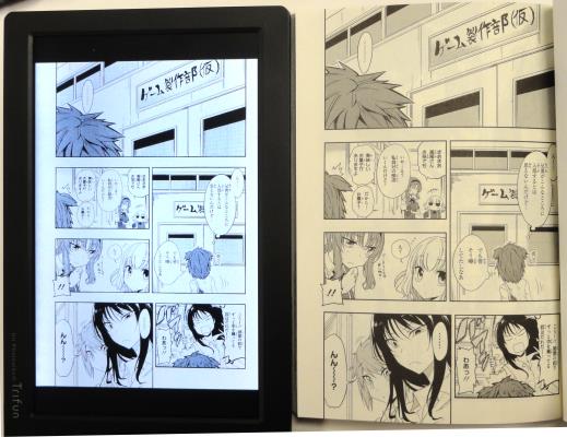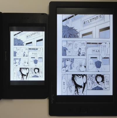 操作法やバッテリの駆動時間はわかったので、肝心の「読みやすさ」を検証してみよう。まずは表示サイズである。漫画のコミックの場合、出版社によっても若干違いがあるが、600dpiでスキャンすると4320×2992ドットになる。これを今回の「Trifun DPF-A8WM10BK」と、これまで使っていた「NewWalker PC-Z1」に合うサイズに縮小すると、それぞれ1109×768ドットと866×600ドットになる。コミックのサイズより液晶ディスプレイサイズの方が縦長になるため、縦方向に余白が出る形だ。ドット数比で1.64倍になっており、かなり詳細になっていることがわかる。またそれぞれ液晶ディスプレイに対して86.6%と84.6%のサイズで表示されており 「Trifun DPF-A8WM10BK」の方が、若干ながら液晶ディスプレイの余白が小さいことになる。また液晶ディスプレイが「NetWalker PC-Z1」の5インチから8インチへアップしたため、実際の表示サイズも実測値で64mm×92.5mmから105mm×151mmへと大型化している。実際に並べてみると、かなり大きくなっていることがわかる。また実際のコミックと並べてみると、差がかなり小さくなっている事がわかる。まだ「Trifun DPF-A8WM10BK」の方が小さいが、コミックのサイズが130mm×183mmなので、縦横それぞれで約82.5%であればそれほど読みにくくない。