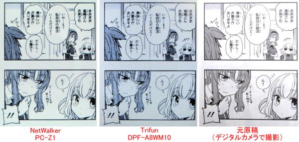 これが実際にコミックの1ページを表示したものをデジタルカメラで撮影したものである。また比較として、コミックをそのままデジタルカメラで撮影したものも元原稿として掲載している。表示の細かさを見るために、サイズは統一してある。1番上の画像は、ページの中の2コマを見たもので、下2つの画像は、その中をさらに拡大し、「印刷文字の部分」と「書き文字と絵の部分」の2カ所を抽出したものである。これを見ると、一番上の画像でも文字や絵の「つぶれ」が「Trifun DPF-A8WM10BK」の方が改善されていることがわかる。また、2枚目の画像を見ると、「部活」などの字がつぶれずにはっきりしているほか、ルビもかろうじて読めるようになっている。元原稿と比べるとかなり劣るように見えるが、実際に全体で見るとかなり差が小さくなっていると感じる。また3枚目の画像を見ると、書き文字が読みやすくなっているほか、「NetWalker PC-Z1」ではくっついてしまっていた髪の線が、しっかりと出ている。トーンのドットなどが判別できるレベルではないが、絵などもかなり細かく見えるようになったのは確かだ。