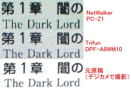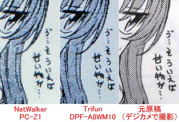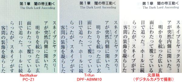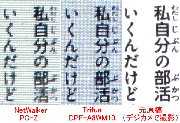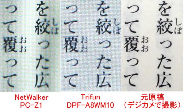実際に小説の1ページを表示したものをデジタルカメラで撮影したものである。また比較として、小説をそのままデジタルカメラで撮影したものも元原稿として掲載している。実際には大きさはばらばらであるが、細かさを見るために、サイズは統一してある。1番上の画像は、ページの一部分を見たもので、下2つの画像は、さらに拡大し「ルビの振られた小説本文」と「上部のタイトル」の2カ所を抽出したものである。これらを見ると、特に複雑な文字やルビなどのつぶれが改善されていることがわかる。また、2枚目を見ると、本文の書体は明朝体であるため、横線が細いこともあって、「NetWalker PC-Z1」では横線が消えかけているほか、横線の「止め」の部分の三角もほぼ無くなっているが、「Trifun DPF-A8WM10BK」では問題なく表示され、漢字本来の形状が出ている事がわかる。元原稿と比べるとかなり荒く見えるが、実際にはもっと小さく表示されているので、差は小さい。また、「NetWalker PC-Z1」と比べるとかなり読みやすくなったように感じる。また3枚目のタイトルは、本文よりさらにフォントサイズが小さいこともあって、「NetWalker PC-Z1」ではかなりつぶれて読めないか、かすれて読めない状態だったが、「Trifun DPF-A8WM10BK」では読めるレベルになっているのはかなりの改善と言えよう。