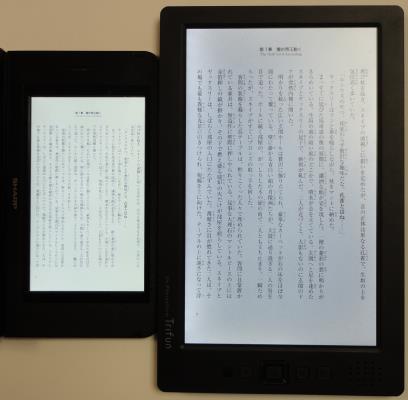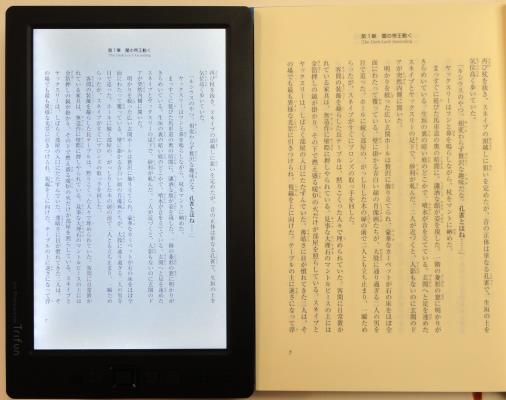 続いて小説の読みやすさである。小説の場合は左右の余白を大きめにカットすることで、画面に合うサイズに調節できる。左右を合わせることになるため、(液晶を縦長にしたときの)横方向の解像度の差だけ細かく表示できることになる。「NertWalker PC-Z1」は横600ドット、「Trifun DPF-A8WM10BK」は横768ドットなので1.28倍、縦も同じだけドット数が増えるので、全体では1.64倍細かな表示ができることになる。また表示サイズは「NetWalker PC-Z1」の横幅64mmで「Trifun DPF-A8WM10BK」の横幅が99.5mmなので1.55倍で、縦も同じだけ大きくなっているので、面積比では2.4倍になっている。かなり大きく、細かくなっていることがわかる。また実際の小説と並べて比較してみる。小説と言ってもいろいろあるが、今回は大きめのA5版のハードカバーの小説を使用した。並べてみると、ちょうど実際の小説の縦の長さと、「Trifun DPF-A8WM10BK」の本体の縦の長さが同じくらいだ。つまり、液晶のフレームとボタンの分だけ表示が小さくなっているというイメージだ。大きめの小説ながら、表示の差はその程度でしかない。実際の小説の大きさは、160mm×218mmである。「Trifun DPF-A8WM10BK」用にスキャンしたものは、上下左右の余白をカットしているが、実際に使用しているエリアを、実際の小説で計ると約124×207mmになる。「Trifun DPF-A8WM10BK」は105mm×174mmなので、縦横それぞれ約84%の大きさと言うことになる。より小さなサイズの小説ならば同等の大きさ、又は逆に大きくなる場合もあるだろう。