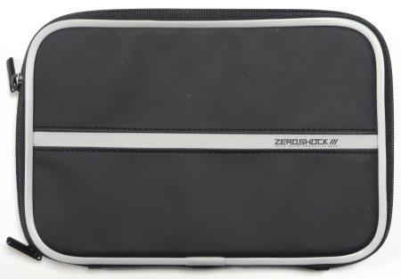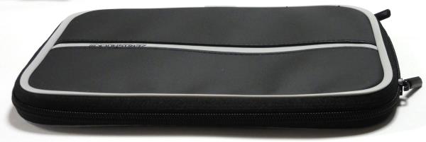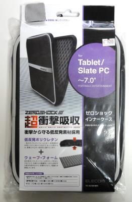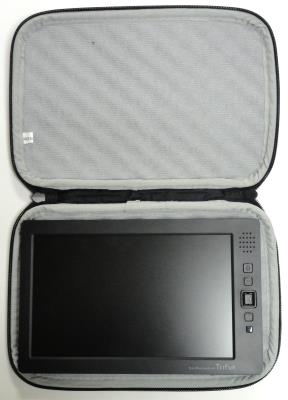 「Trifun DPF-A8WM10BK」を持ち運んで使う上で必要になるのがキャリングケースだ。これまではキーボード付きの機種を使っていたので、液晶ディスプレイ部を閉じることができたが、「Trifun DPF-A8WM10BK」は液晶ディスプレイが出たままなので、このままカバンに入れると液晶ディスプレイに傷が付くなどよくなさそうだ。これまでは電子辞書用の布製ケースを使っていたが、今回は本体サイズがかなり大きくなったので、このケースでは入らない。カバンに入れて持ち運ぶので、大げさなものではなく、できるだけ「Trifun DPF-A8WM10BK」に近いサイズで、持ち手なども不要だ。 まず考えたのが、iPadやAndroidタブレットのケースだ。しかしヨドバシカメラマルチメディア梅田の携帯電話コーナーを見て回っても合いそうなものはなかった。タブレット端末用となると、ずばり特定の機種向けの製品が多く、サイズや厚さだけでなく、角のカーブやカメラの穴の位置まで合わせてあるケースになってしまう。ある程度余裕のある布製や革製のケースもあるが、なかなか良い大きさのものがない。原因として、タブレット端末では7インチ又は9〜10インチという液晶ディスプレイサイズになっていることが原因だ。「Trifun DPF-A8WM10BK」の液晶ディスプレイは8インチで、いくらフレームが小さいとはいえ7インチの機種用のケースには入らない。9〜10インチの機種用のケースには入るが、今度は余裕がありすぎる。カバンの中で無駄なスペースを取ることになる。続いてパソコン用バッグのコーナーを見て回ると、なんと「Trifun DPF-A8WM10BK」にぴったりサイズの製品を発見した。 それがエレコムの「TB-02ZSBIBBK」である。低反発ポリウレタンの採用で衝撃に強く、「Trifun DPF-A8WM10BK」を入れてみたところ、余分な余裕も無く、かといってきつくも無い。側面3辺がファスナーになっているので開閉しやすく、持ち手などの余分なものもない。できればポケットなどが付いてれば、メモリカードなどを入れておけたのだが、仕方がない。1,680円(10%ポイント還元)という価格も気に入って購入した。