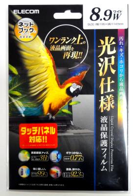 もう一つ気になったのが、液晶ディスプレイだ。持ち運ぶ際はケースに入れているとはいえ、表面はスマートフォンのように固くはないため、ちょっとしたことでも傷が付きそうだ。また光沢液晶でないのも少し気になったため、液晶保護フィルムを貼ることとした。液晶ディスプレイは8インチだが、アスペクト比16:10の1280×800ドットと、アスペクト比16:9の1280×720ドットの中間の1280×768ドットであり、あまり見たことのないアスペクト比だ。そのため8インチの保護フィルムだと、サイズが合わないことがある事から、少し大きめの物を選ぶ必要がある。今回はエレコムの「EF-FL89WHG」を選んだ。光沢仕様でありながら反射防止のAR層があるため、映り込みが抑えられる。メーカー公称の反射率は0.77%と低い。ハードコート層もあり、硬度3Hとキズにも強そうだ。そしてなにより、透過率92.3%というのは、液晶保護フィルムの中ではトップクラスだ。それほど輝度が高くない「Trifun DPF-A8WM10BK」では、できるだけ暗くならないことが重要だからだ。8.9インチ液晶用となっており、サイズ的にも問題ない。ヨドバシカメラマルチメディア梅田で1,210円(10%ポイント還元)であった。実際に貼ってみると、暗くなったという印象もなく映り込みも気にならない。それよりも光沢液晶になり映像が綺麗になったように感じられる。なにより表面が保護されているという安心感がある。