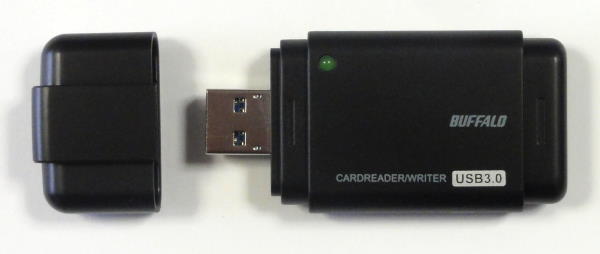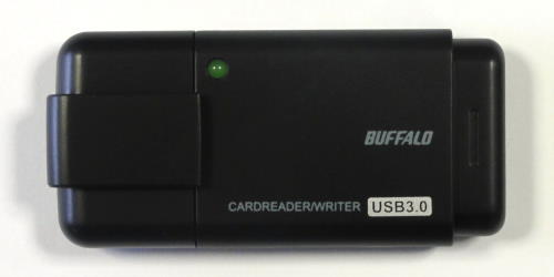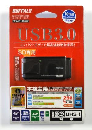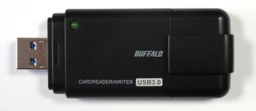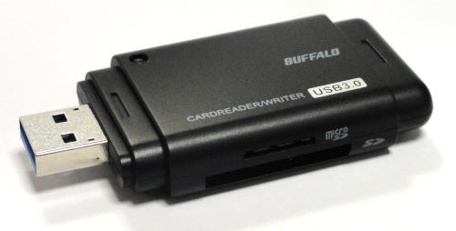 高速化を目的として、UHS-I対応のSDカードを購入することに決めたが、もう一つUHS-I高速転送対応のメモリカードリーダー・ライターも購入しなければならない。UHS-I対応のメモリカードリーダー・ライターを購入する際にUSB3.0接続に対応しているかも重要だ。USB2.0の転送速度は480Mbps=60MB/s、実際には40MB/s強の転送速度になる。UHS-I対応でもUSB2.0接続だと今度はこちらかボトルネックになってしまう。UHS-Iの製品自体が出始めと言うこともあって対応機種が少なく、USB3.0対応となるとさらに少ないが、その中で選んだのがバッファローの「BSCRSDXU3BK」である。USB3.0対応のメモリカードリーダー・ライターというと、SDカード、メモリースティック、xDピクチャーカード、コンパクトフラッシュといった様々なカードに対応していることが多いが、我が家では実質SDカードしか利用しておらず、それ以外のスロットは無駄である。その点「BSCRSDXU3BK」はSDカードとmicroSDカードのスロットを持つだけとシンプルで、またUSB端子が内蔵されているので、ケーブルを挿す必要が無く、「BSCRSDXU3BK」を直接パソコンのUSB3.0ポートに挿し込んで使える。SDカードとmicroSDカードのみ対応の製品にしてはサイズが大きいが、これは高速転送に対応しているためだろう。様々なメモリカードに対応した製品より安価だったので、この製品に決定した。価格はヨドバシカメラマルチメディア梅田で2,480円(10%ポイント還元)であった。