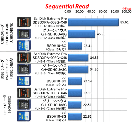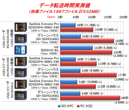 それでは、速度をテストしてみよう。今回は「BSCRSDXU3BK」の速度をテストするため、3枚のカードと2つのカードリーダー・ライターを用意した。「BSCRSDXU3BK」はUSB3.0接続に加えUSB2.0接続も行っているため、3つのカードで3通りの計9種類の結果を見て、「BSCRSDXU3BK」の実力を検証してみたいと思う。 今回用意したメモリカードの内、UHS-I対応の物はSanDiskのExtreme Pro 「SDSDXPA-008G-X46」とグリーンハウスの「GH-SDHCUA8G」である。UHS-I対応製品は価格が高く、出始めと言うこともあって製品も少ない。SanDiskは複数の「UHS-I」対応製品を発売しており、その中で「SDSDXPA-008G-J35」は読込95MB/s、書込90MB/sと超高速だが、8GBの容量ながら5,500円前後と価格もかなり高い。しかし、「SDSDXPA-008G-J35」の海外輸入パッケージである「SDSDXPA-008G-X46」がパソコンパーツショップなどでは手に入る。保証期間が短いなどの違いはあるが、読込95MB/s、書込90MB/sという点は同じで、2,980円と比較的安価に手に入る。また、グリーンハウスの「GH-SDHCUA8G」は同じUHS-Iでも半額の1,480円で手に入る。こちらは、読込40MB/s、書込12MB/sとなっており、特に書き込みが遅い。この2枚に加え、UHS-I非対応のpqiの「BSDH10-8G」も比較対象として加えている。3枚詳しいスペックは以下の通りである。