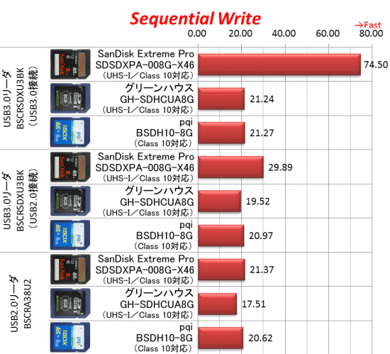 次にシーケンシャルライト性能である。UHS-I対応カードの中でも高性能な「SDSDXPA-008G-X46」は「BSCRSDXU3BK」のUSB3.0接続の場合74.50MB/sと非常に高速な結果を出した。シーケンシャルリード同様、公称値の90MB/sよりはやや劣るが、比較的カード本来の性能を発揮できていると言えるだろう。UHS-I対応カードの中で低速な「GH-SDHCUA8G」でも21.24MB/sと公称値以上の速度を記録している。UHS-I非対応のメモリカード「BSDH10-8G」と同じ速度なのでUHS-I高速転送の意味がないように見えるが、UHS-I高速転送非対応のメモリカード「BSCRA38U2」を使用すると17.51MB/sしかでないため、書き込みが遅い「GH-SDHCUA8G」がUHS-I高速転送を行う事で、他のメモリカード並みになっていると言え、十分にUHS-Iの効果は出ているといえる。 ただしシーケンシャルリード同様、USB2.0接続にすると速度は低下する。UHS-I高速転送非対応のメモリカードリーダー・ライターを使用するよりは高速だが、29.89MB/sまで落ちてしまう。USB2.0接続ではこのくらいが限界だろう。特に高速なSDカードを使用する場合は「BSCRSDXU3BK」をUSB3.0接続する事が重要だ。また、こちらもシーケンシャルシードと同じく、UHS-I非対応のSDカード「BSDH10-8G」の速度を向上させる力は無いようだ。