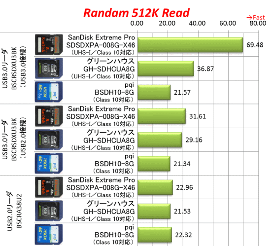 次にランダムリードの性能を見てみよう。512KB単位のランダムアクセスなので、比較的大きなサイズのランダムアクセスである。これを見るとシーケンシャルリードの時と同じような結果となっている。UHS-I対応カードとUSB3.0接続の「BSCRSDXU3BK」の組み合わせでは非常に高速になる。USB2.0接続でも、UHS-I非対応のメモリカードリーダー・ライターよりは高速だが、カードの真の性能を発揮するためにはUSB3.0接続も重要な条件だ。UHS-I非対応のSDカード「BSDH10-8G」の速度は特に高速化していない。