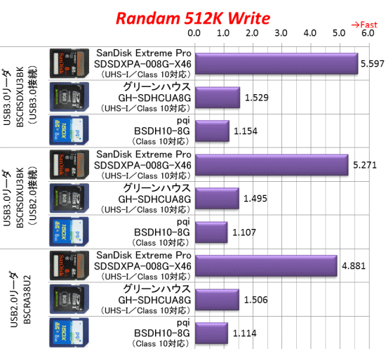 次にランダムライトの性能である。こちらも512KB単位の比較的大きなサイズのランダムアクセスである。ここでは、これまでと異なる結果となっている。「SDSDXPA-008G-X46」の結果を見ると、USB3.0接続の「BSCRSDXU3BK」の場合5.597MB/sと他のメモリカードより非常に高速になっているのはこれまでと同様だ。ところがUHS-I高速転送非対応の「BSCRA38U2」を使用した場合でもも4.881MB/sとなっており、他のカードより高速になっているのである。同様にもう一枚のUHS-I対応カードの「GH-SDHCUA8G」も、UHS-I非対応の「BSDH10-8G」と比べてやや高速だが、これはUHS-I高速転送非対応の「BSCRA38U2」を使用しても同じ傾向である。結果、ランダムライトでは、「BSCRSDXU3BK」が高速と言うよりはSDカード自体の性能の差と言え、カードが高速ならばメモリカードリーダー・ライターは特に関係がないようだ。残念ながら、ランダムライトの場合「BSCRSDXU3BK」はあまり意味をなしていないことになるのは残念だ。