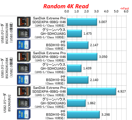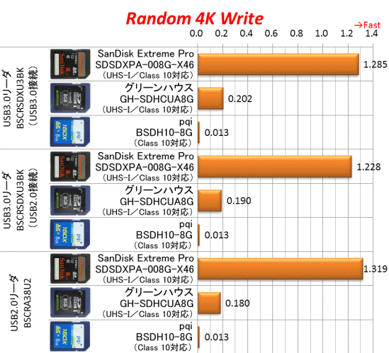 ランダムライト4Kの結果はランダムライト512Kの結果と同傾向だ。「SDSDXPA-008G-X46」「GH-SDHCUA8G」「BSDH10-8G」の順で高速で、しかも大きな差が開いている。しかしカードリーダー・ライターによる差は出ておらず、カードリーダー・ライターがUHS-I高速転送に対応しているかどうかや接続方式に関わらず、カードの性能によるものの様だ。その点では、「BSCRSDXU3BK」を購入する意味は薄い。
