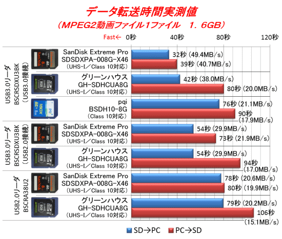 まずは、「MPEG2動画ファイル1ファイル1.6GB」の結果である。デジタルカメラ等で撮影したビデオをパソコンに転送する場合や、パソコン上の動画ファイルをスマートフォンなどに入れて持ち出す場合を想定している。 これを見ると、カード本来の転送速度がそのまま結果に反映されている印象だ。UHS-I高速転送対応のカードリーダー・ライター「BSCRSDXU3BK」をUSB3.0接続した場合、もっとも高速な「SDSDXPA-008G-X46」では、SDカードからパソコンが32秒、逆が39秒である。これは、UHS-I高速転送非対応のカードリーダー・ライター「BSCRA38U2」を使った場合(それぞれ78秒と80秒)と比べて、41%と49%の時間になっている。ベンチマークテストほど大きな差ではないがかなりの時間差だ。例えば、長時間のビデオ撮影をした動画が16GBだったとすると、「BSCRA38U2」では13分もかかるところ、「BSCRSDXU3BK」では5分20秒で転送できることになる。この待ち時間の差はかなりの物だ。また、ベンチマークテストで遅かった「GH-SDHCUA8G」でもカードリーダーによる差は出ている。また、「BSCRSDXU3BK」をUSB2.0接続した場合でも、52秒と73秒で、特にSDカードからパソコンへの転送が高速だ。現在USB3.0環境が無くても、とりあえずUSB2.0接続で使っても効果ははっきりと感じ取れるはずだ。