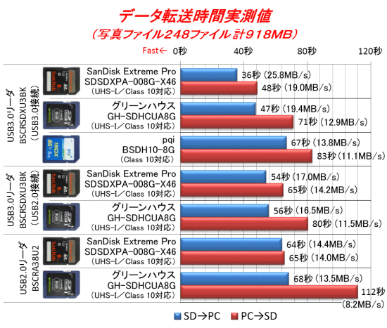 続いて写真データである。デジタルビデオカメラで撮影した248枚の写真(JPEG形式)の転送速度である。248枚で918MBなので、平均3.7MBのファイルである。先ほどの動画データと比べると、1つのファイルサイズが小さくなっている。UHS-I対応カード「SDSDXPA-008G-X64」の結果で比較してみると、「BSCRSDXU3BK」ではSDカードからパソコンへの転送が36秒、逆が48秒である。これが「BSCRA38U2」を使うと64秒と65秒である。「BSCRSDXU3BK」ではそれぞれ56%と74%の時間で完了する。特にデジカメのデータの場合、SDカードからパソコンへの転送を行うことがほとんどだと思われるため、こちらの方がより高速なのはうれしいところだ。「BSCRSDXU3BK」をUSB2.0接続した場合でもSDカードからパソコンへの転送では高速なので、「BSCRSDXU3BK」を使う意味はあるだろう。
