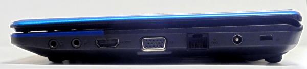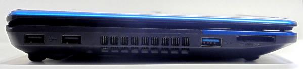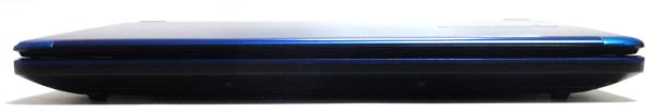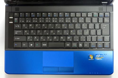 箱から取り出してみると、思っていたよりも小さいと感じた。一方で重量に関してはそれなりに重くなっているとも感じた。本体のブルーは塗料のべた塗りではなく、細かな筋が入ったヘアライン加工のブルーなので、高級感がある。天板はすべてこの色である。一方液晶ディスプレイをあけると、内部は落ち着いている。同じブルーなのはパームレスト部分だけで、キーボードの周囲や液晶ディスプレイのフレームはブラックだ。キーボードはブラックの方が文字が見やすいし、液晶ディスプレイのフレームはブラックの方が落ち着いていて液晶ディスプレイに集中できる。本体カラーがブルーだとは言っても、ブラックの方が良いところはブラックにしてあるのは好感が持てる。ちなみにパームレスト部分のブルーは天板のブルーと同じ色だが、こちらはヘアライン加工ではなく、ザラザラとしたつや消し仕上げである。 バッテリは背面に取り付ける。そのため背面には端子類は一切無い。右側面は手前側からイヤホン端子、マイク端子、HDMI出力、D-Sub15ピン、有線LAN、電源コネクタ、セキュリティスロットである。小型の機種ながらHDMIはmicroHDMIではなく標準サイズなのはうれしいところだ。左側面は、手前側からSD/MSスロット、USB3.0ポート、排気口、USB2.0ポート×2である。3基中1基のみだがUSB3.0に対応しているのはうれしいところだ。ただ、USBポートが3基とも左側面なのは気になる。マウスなどの接続を考えれば1基は右側面で又は背面の右寄りにほしいところだ。ただUSBケーブルをつないだ際に、マウス操作の邪魔にならないという点では便利とも言える。また、2基のUSB2.0ポートは比較的間隔が開けられているので、大きめのUSB機器を接続してももう一方のポートが使えないという事は少なそうなのはうれしい点だ。排気口が手前寄りなのも気になるが、左側面にあるだけ良しとしよう。右側面にあるとマウス操作する手に当たり、大変なことになる。気になるのはSD/MSスロットである。奥まで挿し込むことができないのだ。挿し込んだまま持ち運ぶとカードを損傷しそうなので、カバンなどに入れる際は必ずカードを抜いておく必要がある点は注意が必要だ。 前面は薄く見せるため下部が大きく内側に面取りされているため、端子類はないが、右側に各種LEDが並んでいる。ブルーのLEDは明るいところでも見やすいのは良いのだが、前面に付いているだけだとLEDが見にくいという問題がある。前面だけでなく上方にもLEDの明かりが見えれば良かったのだが。