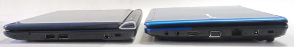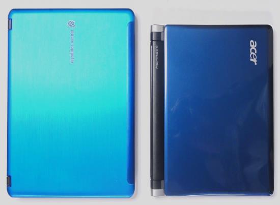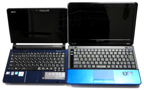 もう一つ気になるのは、堅牢性がいまいちな点だ。キーボード面や液晶ディスプレイ面はしっかりしているのだが、パームレスト部や、本体の裏側が少し力を入れるとたわむのである。携帯する機種だけに少々気になるところだ。ただ圧力に弱そうな液晶ディスプレイ面がしっかりしているのでまだましと言えよう。 これまで使っていたネットブックパソコン「Aspire One D250」と並べてみると、液晶ディスプレイが10.1インチから11.6インチに大きくなった分だけ、本体サイズも一回り大きくなった印象だ。同じ青系統の本体ながら、「Aspire One D250」の紺色から、やや薄い青になったため、明るい印象になっている。ただ、液晶を閉じた状態で並べてみると、横幅は少し大きくなっている物の、縦はそれほどでもないことがわかる。確かに本体サイズは、「Aspire One D250」の258×184mmに対して、「LB-S210B」は288×195mmなので、横幅は3cm大きくなっているが、縦は1.1cmしか大きくなっていない。奥行きはまた横から見ると意外と差は少ない。「Aspire One D250」の25.4mm、「LB-S210B」は36mmと数値上は大きな差があるが、全体に厚みがほとんど変わらない「Aspire One D250」に対して、後方が厚くなっている「LB-S210B」では、前方の厚みはほとんど変わらない。数字ほどの差はないと言える。前方に傾いている方がキーボードが打ちやすいのもメリットだ。