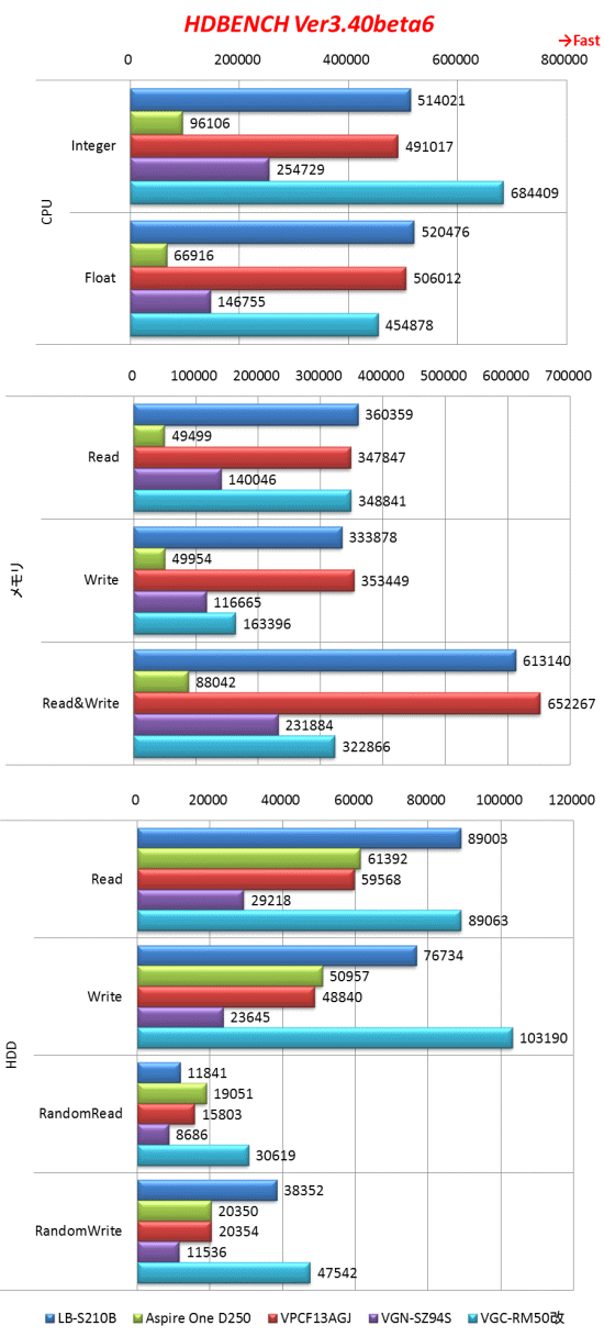 それではベンチマークテストの結果である。まずは定番の「HDBENCH Ver3.40beta6」のCPUスコアである。「LB-S210B」はInteger、Floatの両方で僅差ながら「VPCF13AGJ」を上回っている。つまり、1.73GHzの4コア8スレッドのCore i7より、2.4GHzの2コア4スレッドのCore i3の方が上と言うことになる。動作クロックが高さがコア数の差を埋めたという所だろう。もちろんコア自体も1世代新しいことも影響していそうだ。また、旧世代のCPUながら4コア4スレッドのCore 2 Quadを搭載し、動作クロックも「LB-S210B」と同じ2.4GHzである「VGC-RM50改」との比較では、Integerでは24.8%低く、Floatは14%高いという結果が出た。同じ4スレッドながら「LB-S210B」は2コアをHyper-Threading機能で4スレッド処理を行っているのに対して、「VGC-RM50改」はリアルな4コアだ。やはり、実際にコア数が多い方が有利なのだが、そのわりに近い性能が出ている事に驚きである。初代のCore 2 Quadと2代目Core i3ではかなり世代も変わっているので、クロックあたりの性能がずいぶん向上したことがわかる。ちなみに、これまで使ってきた「Aspire One D250」との比較ではIntegerでは5.3倍、Floatは7.78倍と大きな差となっており、いかに快適になったかがわかる結果だ。また、「LB-S210B」と同じ2コアながらCore 2 Duoの1.80GHzである「VGN-SZ94S」とも大差になっており、安価ながら古いパソコンとはレベルの違いが出ていると言える。 メモリのテスト結果では、「VPCF13AGJ」とほぼ同じ結果となっている。どちらも同じPC3-10600のDDR3 SDRAMのデュアルチャンネルなので、当たり前と言えば当たり前だ。これまで使ってきた「Aspire One D250」や古い「VGN-SZ94S」とはかなりの差となっている。 HDDのテストでは「VPCF13AGJ」や「Aspire One D250」を上回る性能を見せている。高価な「VPCF13AGJ」と、非常に安価な「Aspire One D250」の結果が似ていることからわかるように、ハードディスクの性能は同じ時期のパーツの安価・高価より、新しいか古いかの方が重要だ。つまりSSDを搭載するならまだしも、ハードディスクの場合、特にノートパソコン用では回転数はほとんど上がらないため、プラッタ容量が重要になる。今回も「LB-S210B」「VPCF13AGJ」「Aspire One D250」の3製品はいずれも回転数は5400rpmで変わらない。しかし、プラッタ容量が「VPCF13AGJ」の250GBや「Aspire One D250」の160GBに対して、「LB-S210B」では500GBと多く、同じ回転数でもプラッタ容量が高いと読み書き性能は上がる事から、今回のような結果になったと言える。性能面では問題ないレベルだ。