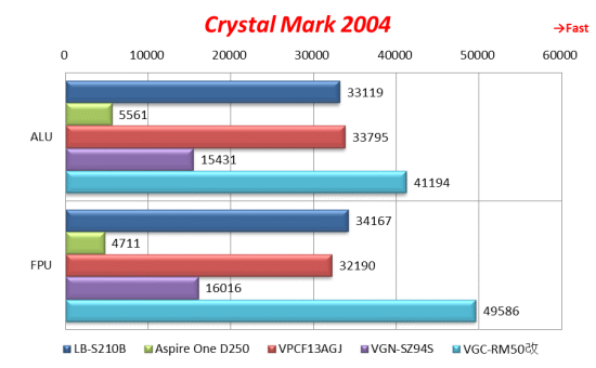 続いて、「Crystal Mark 2004」の結果である。「LB-S210B」はここでは「VPCF13AGJ」とALUでは僅差で負け、FPUでは僅差で勝ちと言うことになってはいるが、ほぼ同性能という点で「HDBENCH Ver3.40beta6」 と同傾向だと言える。コア数の不足を動作クロックの高さとコア自体の新しさで補っている形だ。「LB-S210B」は低価格だが、CPUの性能面で「VPCF13AGJ」と変わりなく使える事がわかった。傾向が違うのは「VGC-RM50改」でALU、FPUともに「LB-S210B」を上回っている。「HDBENCH Ver3.40beta6」と結果が異なる理由はわからないが、このテストはHyper-Threadingでの効果が出にくく、実コア数の多さが有利に働いたということも考えられる。これまで使ってきた「Aspire One D250」との差は、ALUで5.96倍、FPUで7.25倍と同じくかなりの差だ。