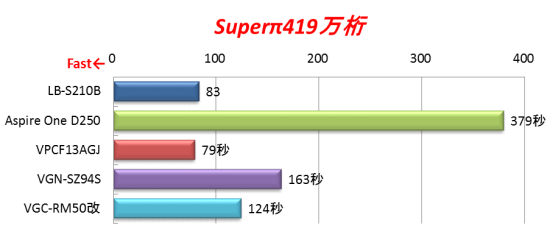 もう一つ、「Superπ419万桁」の結果である。テストはシンプルだが、はっきりと処理時間で結果が出るため分かりやすい。これを見ると、「LB-S210B」は83秒と、「VPCF13AGJ」の79秒に後一歩まで迫っている。2コアながら侮れない性能であることがわかる。同じ4スレッドで動作クロックも同じ「VGC-RM50」は124秒と結果がふるっていない。「LB-S210B」の性能の良さがわかる。「Aspire One D250」との差では、4.57倍とやはりかなり高速だ。