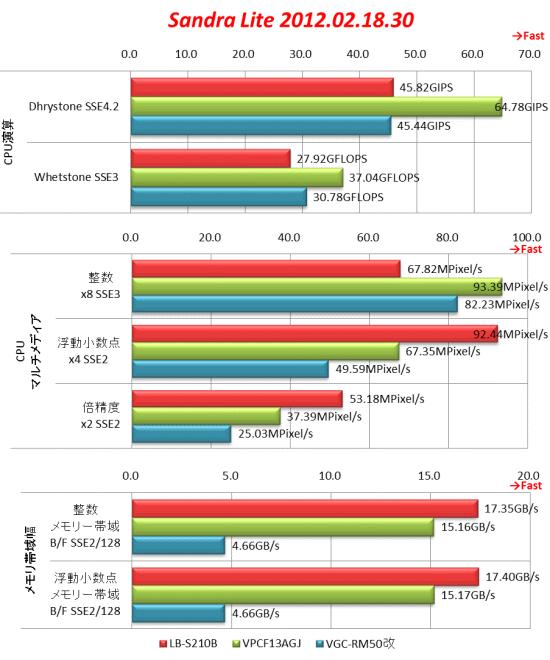 「Sandra Lite 2012.02.18.30」の結果である。「Aspire One D250」ではテストが実行できず、「VGN-SZ94S」はこのテストが公開されるより前に壊れているため、3機種の比較となる。これを見ると、CPU演算 性能では、「LB-S210B」は「VPCF13AGJ」より35.3%劣っているが、「VGC-RM50改」とほぼ同性能となっている。また、CPUマルチメディアでは、「LB-S210B」は「VPCF13AGJ」と同性能で、「VGC-RM50改」より24.0%も上回っている。なかなかの性能である。また「LB-S210B」のメモリ帯域幅は17.37GB/sとなっており、「VPCF13AGJ」の15.16GB/sや「VGC-RM50改」の4.66GB/sより高速だ。「VGC-RM50改」はPC2-5300のDDR2 SDRAMのデュアルチャンネルなので、帯域幅が狭いのはわかるが、「LB-S210B」と「VPCF13AGJ」はPC3-10600のDDR3 SDRAMのデュアルチャンネルという点で同じである。なぜ、帯域幅に差が出たのかは不明だ。チップセットの違いによるものだろうか。