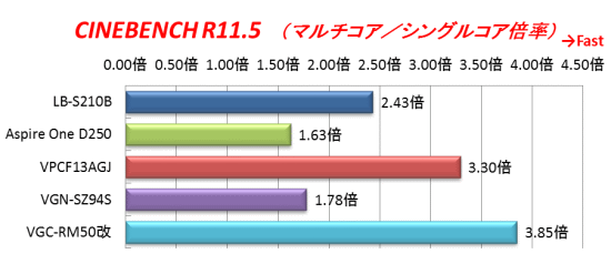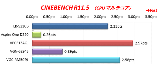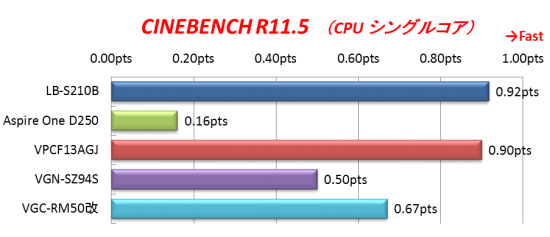 CPU性能の違いをもう少し詳しく検証してみよう。使用したのは「CINEBENCH R11.5」である。このベンチマークテストは、シングルコアとマルチコアでテストを実行できるため、コア数が異なるCPU間で、コアの性能を比較できたり、マルチコアになることでどの程度効果があるのかをはっきり見ることができる。 「LB-S210B」はシングルコアでは0.92pts、マルチコアでは2.23ptsという結果である。倍率は2.43倍となる。4スレッド処理である事を考えると2.43倍というのは寂しく見えるが、実際のコア数は2コアだ。それをHyper-Threadingにより4スレッド処理にしているのである。2コア2スレッドのCPUでも2倍にはならない事を考えると(たとえばVGN-SZ94Sでは1.78倍)、2コアで2倍以上になっているのはHyper-Threading機能が有効に働いている事の証明と言える。Hyper-Threading機能がなければもっと性能は低くなるだろう。次に「VPCF13AGJ」と比較してみよう。「VPCF13AGJ」のマルチコアの結果は2.97ptsであり、さすがに「LB-S210B」を上回っている。しかし、「VPCF13AGJ」は4コア8スレッドであり、コア数が「LB-S210B」の2倍である。動作クロックに2.4GHzと1.73GHzという差があることを考えても、思ったよりも差は小さい。そこで、シングルコアの時の結果を見てみると、「LB-S210B」が0.92、「VPCF13AGJ」は0.90となっている。しかも「VPCF13AGJ」はシングルコア動作時はTurboBoost機能により動作クロックは2.93GHzまでアップする。実際にテスト中の動作クロックは2.93GHzまで上がっていた。一方の「LB-S210B」は2.40GHzである。動作クロックが22%高い「VPCF13AGJ」の方が2.2%だが性能で下回っているのだ。もし「VPCF13AGJ」の動作クロックを同じ2.4GHzになるよう換算すると、シングルコアの結果は0.74となり、「LB-S210B」を大きく下回ることになる。つまり、Core iシリーズとしては「LB-S210B」の方が1世代新しく、それだけクロックあたりの性能がアップしていると言えるのだ。もちろん、チップセットの違いなどもあるだろうが、CPUの改良が大きいと思われる。今回、「LB-S210」では「VPCF13AGJ」よりコア数も少なく、シングルコア動作時は動作クロックも低いCore i3を選んだ。Core i3はCore iシリーズの中では下位の製品だが、少し前の上位のCore i7に近い性能が発揮できているのは、思ったよりも性能面で妥協する必要が無く安心である。またCore iシリーズの中という短い期間の新旧でありながら性能差がここまであるとは正直、驚きである。 では他の機種とも比較してみよう。まず、これまで使っていた「Aspire One D250」はマルチコアで0.26、シングルコアで0.16である。マルチコアでは「LB-S210B」は8.58倍の性能であり、コア数が少ないことを考えても、いかに「Aspire One D250」が遅かったかがわかる結果だ。コア数が関係ない、シングルコアの性能も、「LB-S210B」は5.75倍の性能を持っている。動作クロックが約3分の2である事を考えても、Atomのクロックあたりの性能が非常に低い事がわかる。 動作クロックとスレッド数が同じ「VGC-RM50改」のマルチコアの結果は2.56であり、「LB-S210B」をやや上回っている。ただシングルコアの結果は0.67と「LB-S210B」の72.8%の性能だ。初代Core 2 Quadなので、「VPCF13AGJ」との間以上に世代が開いているため、クロックあたりの性能は低い。ただ、「VGC-RM50改」は同じ4スレッドでも実際に4コア搭載しているため、2コア4スレッドの「LB-S210B」よりはマルチコアの性能ではかろうじて上回れている。しかし逆に言えば、2コアと4コアでは4コアの方が圧倒的に性能が高いはずが、コア自体の改良とHyper-Threadingによって、近い性能が出ているとも考えられる。これを見ても、「LB-S210B」のCPU性能は決して低くはない。 「VGN-SZ94S」との比較では、同じ2コアとは思えない差が出ている。シングルコアの結果をでも、「VGN-SZ94S」が0.50に対して、「LB-S210B」は0.92と大きな差がある。動作クロックの差がある事を考え、純粋に「VGN-SZ94S」と「LB-S210B」の動作クロックの差である1.33倍をして、擬似的に2.4GHz相当に計算しても0.67である。ほぼ同じ世代のCore 2 Quad Q6600を搭載している「VGC-RM50改」のシングルコアの結果がほぼ同じなので、大きなズレはないだろう。つまりコアの改良により、「LB-S210B」のCore i3-2350Mの方が1.37倍性能がアップしていると言うことになる。そしてマルチコアの性能は、「VGN-SZ94S」が0.89に対して、「LB-S210B」が2.23と、2.51倍になっている。コアの違いによる差は1.37倍と推定され、コア数は一緒なので、残る1.83倍がHyper-Threadingによる4コア処理の恩恵と言うことになるだろう。コアの改良、動作クロックの向上、Hyper-Threadingと様々な改良によってCore i3といえども侮れない性能になっていると言うことがわかる。