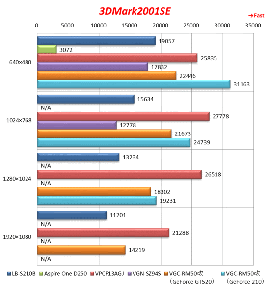 続いて、3Dグラフィックのベンチマークテストを行ってみよう。なお、ここからは「VGC-RM50改」のグラフィックボードをGeForce 210の場合に加え、GeForce GT520の場合も併せて比較してみよう。なお、「LB-S210B」のディスプレイは1366×768ドットだが、それ以上の解像度でテストを行う場合は、別途1920×1080ドットの外付けディスプレイを接続してテストを行っている。一方、「VGC-RM50改(GeForce 210)」の際は1280×1024ドットのディスプレイを接続しており、これより高い解像度のディスプレイを手に入れたのは、GeForce GT520に換装した後だったため、1280×1024ドット以下のテストしか行えていない。また「VGN-SZ94S」も内蔵ディスプレイでしかテストを行っておらず、現在では故障している事から追加でテストも行えないため、内蔵ディスプレイの解像度以下でのテストしか行っていない。またそれ以外に、ベンチマークテストによっては選択できない解像度があったため、その項目は「N/A」となっている。 まずは3DMark 2001SEである。「2001」の数字が示すとおり2001年に発表されたベンチマークテストなので今から11年前のテストだ。DirectX8.1世代のベンチマークテストであり、今となっては非常に軽いテストだが、逆に「Aspire One D250」がこのくらい軽いテストしか動作しないので、比較としてはテストを行っている。それでも「Aspire OneD250」では640×480ドット以上ではテストが正常に完了せずN/Aとなっている。640×480ドットの結果を見ると、「Aspire One D250」と比べると「LB-S210B」は6倍以上の性能となっており、またCPU内蔵のグラフィック機能といえども他の機種に近い性能が出ている。ただし、低解像度では結果が頭打ちになっていると思われるため、より高解像度の結果をみていこう。1024×768ドットでは、GeForce 8400M GSを搭載する「VGN-SZ94S」をやや上回る物の、GeForce GT425Mを搭載する「VPCF13AGJ」やGeForce GT520を搭載する「VGC-RM50改」はおろか、GeForce 210を搭載する「VGC-RM50改」にも及ばない結果である。ただ、1920×1080ドットの結果を見ると、「VGC-RM50改(GeForce GT520)」の78.8%の性能となっており、最新のローエンドグラフィックボードにかなり近づいている事がわかる。