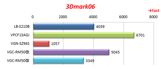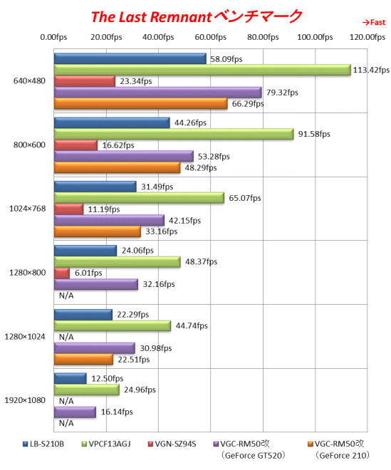「The Last Remnantベンチマーク」である。こちらでは「VGC-RM50改(GeForce 210)」の性能を超えられない結果となった。一方で「VPCF13AGJ」との差はかなり大きくなっている。Intel HD Graphics 3000 搭載の「LB-S210B」は性能が出やすいテストと出にくいテストがあるようである。